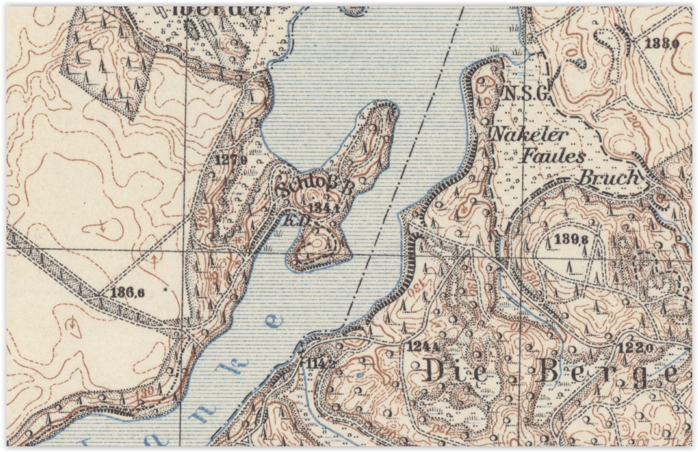 A co z mostem przez jezioro? W latach dwudziestych XX wieku przy niskim stanie wody widoczne były jeszcze jego dębowe pale. Relikty mostu badali płetwonurkowie w latach 1976 i 1982. Stwierdzono wtedy, że dębowe pale miały średnicę od 30 do 40 cm oraz długość sięgającą 15 m. Odkryto także spoczywającą na dnie jeziora łódź dłubankę.